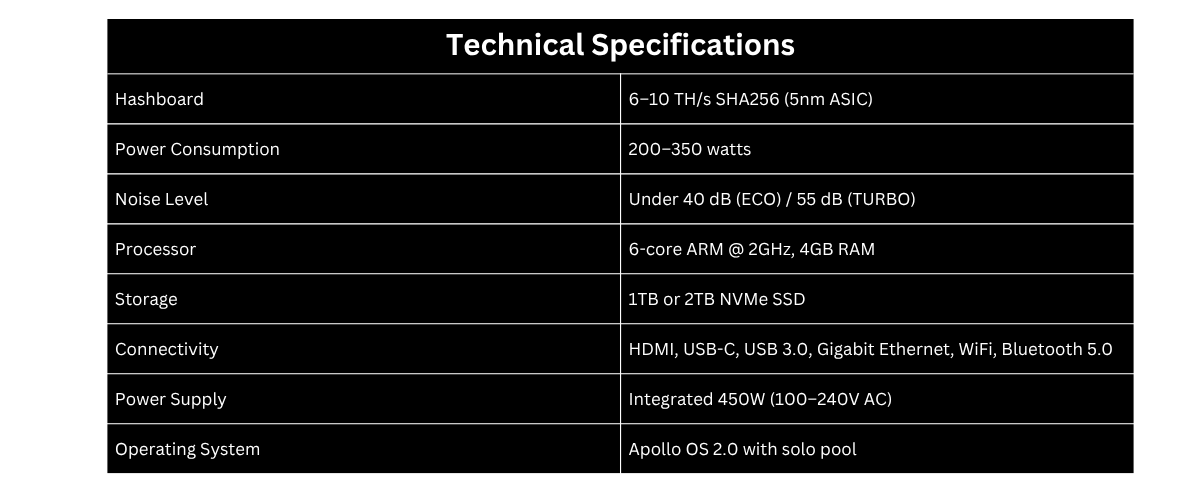 Its 6-10 TH/s performance gives genuine block-finding potential. The integrated full node ensures mining to your verified blockchain. Apollo OS 2.0 makes setup simple for beginners while offering advanced features for experienced miners.